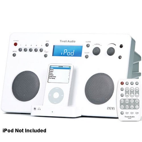 Tivoli iYiYi High-Fidelity AM/FM Stereo System with Alarm Clock and iPod Dock (White/Silver)?For those who want great sounding music, the Tivoli Audio iYiYi Hi-Fidelity Stereo System for iPod with state-of-the art AM/FM radio, built-in alarm and digital clock provides the ultimate listening experience. (TechEBlog) The iYiYi features an integrated iPod Universal Dock that fits its all docking iPods (7 dock adapters included), including the iPod Nano and iPod with video models. The docking station recharges the iPod when docked and the supplied remote control operates the functions of the iYiYi and iPod, including iPod menu items, playlists, and albums. The iYiYi features a highly sensitive digital AM/FM tuner for clear and precise reception, with internal and external FM antennas and built-in AM antenna. Stations may be tuned manually or via 5 AM and 5 FM favorite station preset buttons with a seek function to automatically search for stations. It utilizes two 3 full-range video-shielded drivers with bass reflex design for extended bass response and superior sound quality. (CNET) It also features an auto-brightness blue backlit LCD display with Radio Data System (RDS) information where available. The LCD shows the station tuning as well as the digital clock, whose functions include alarm and 20-minute sleep timer that can be set to wake or fall asleep to an iPod or AM/FM radio. The iYiYi also has a stereo headphone output and auxiliary input for use with a TV, game console, computer or CD player. The iPod dramatically improves your choice of music. The iYiYi dramatically improves the sound of your iPod. Available in gloss white/silver, also in gloss black/silver to match any iPod. Dimensions: 7.36 High X 11.88 Wide x 8.66 Deep (including dock)