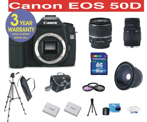 Canon EOS 50D 15.1 Digital SLR Camera with Canon EF-S 18-55mm IS Lens + Sigma 70-300mm Telephoto Zoom Lens + .42x Wide Angle Lens with Macro + 16 GB Memory Card + Multi-Coated 3 Piece Filter Kit + Digital Slave Flash + Corel MediaOne Plus Software + 11 Piece Accessory Kit + Deluxe Camera Case + 3 Year Warranty Repair Contract