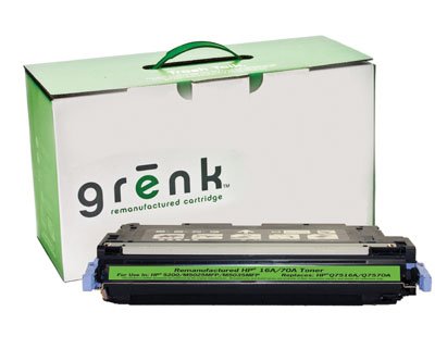 Grenk - HP Q7516A 70A 5200 Compatible Toner . QualityOur remanufactured cartridges endure a comprehensive quality control process including documented disassembly, cleaning, filling, component replacement and quality testing. Your cartridge has been specifically designed and engineered to achieve optimum page count and print performance. You can feel confident about this 100% post-tested remanufactured cartridge.EnvironmentMillions of cartridges are discarded into local landfills every year, which is why using remanufactured cartridges is a great way to reduce your reliance on newly manufactured cartridges.It?s one thing to recycle a print cartridge. With grenk, we recycled the entire process, finding new ways to make ourcartridges ? and our entire business ? more eco-friendly and sustainable.Cost SavingsOur cartridges are remanufactured in the United States of America, and are a cost-effective option to replace your original printer cartridges.2-Year Manufacturer WarrantyEvery cartridge is 100% guaranteed to be free of defects in workmanship and materials. We warrant, subject to special conditions and under normal use, that our recycled cartridges will not cause damage, deterioration, or abnormal wear in any compatible machine for which the cartridge was originally designed. In the event that our cartridge adversely affects your machine, we will service or repair your machine at our expense.